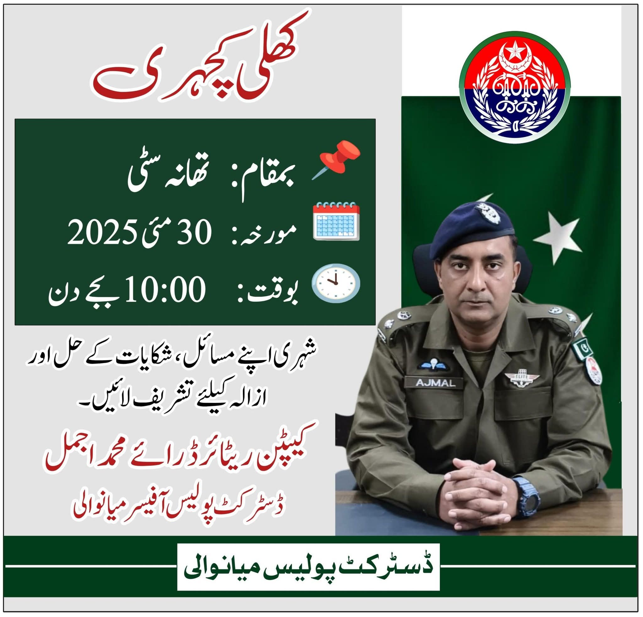 ڈسٹرکٹ پولیس افیسر میانوالی کیپٹن ریٹائرڈ رائے محمد اجمل کی تھانہ سٹی میں کھلی کچہری شہریوں کی بڑی تعداد میں کھلی کچہری میں شرکت ڈی پی او نے سائلین کی…