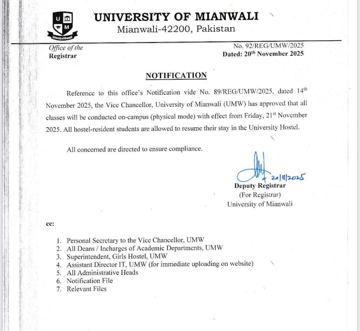 یونیورسٹی آف میانوالی کھل گئی اکیس نومبر جمعہ کے دن سے تدریسی عمل بحال طلبہ کو حاضری یقینی بنانے کی ہدایت